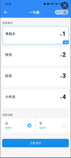 温馨提示:部分洗衣机控制器只接入一台洗衣机(干衣机或洗鞋机),注意控制器设备上的选左或者选右,避免因选错设备导致无法使用和无效支付。