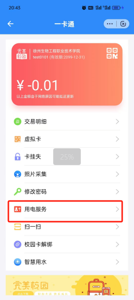 1.进入方式:智慧徐生(点击此处下载)→我的→我的一卡通→用电服务