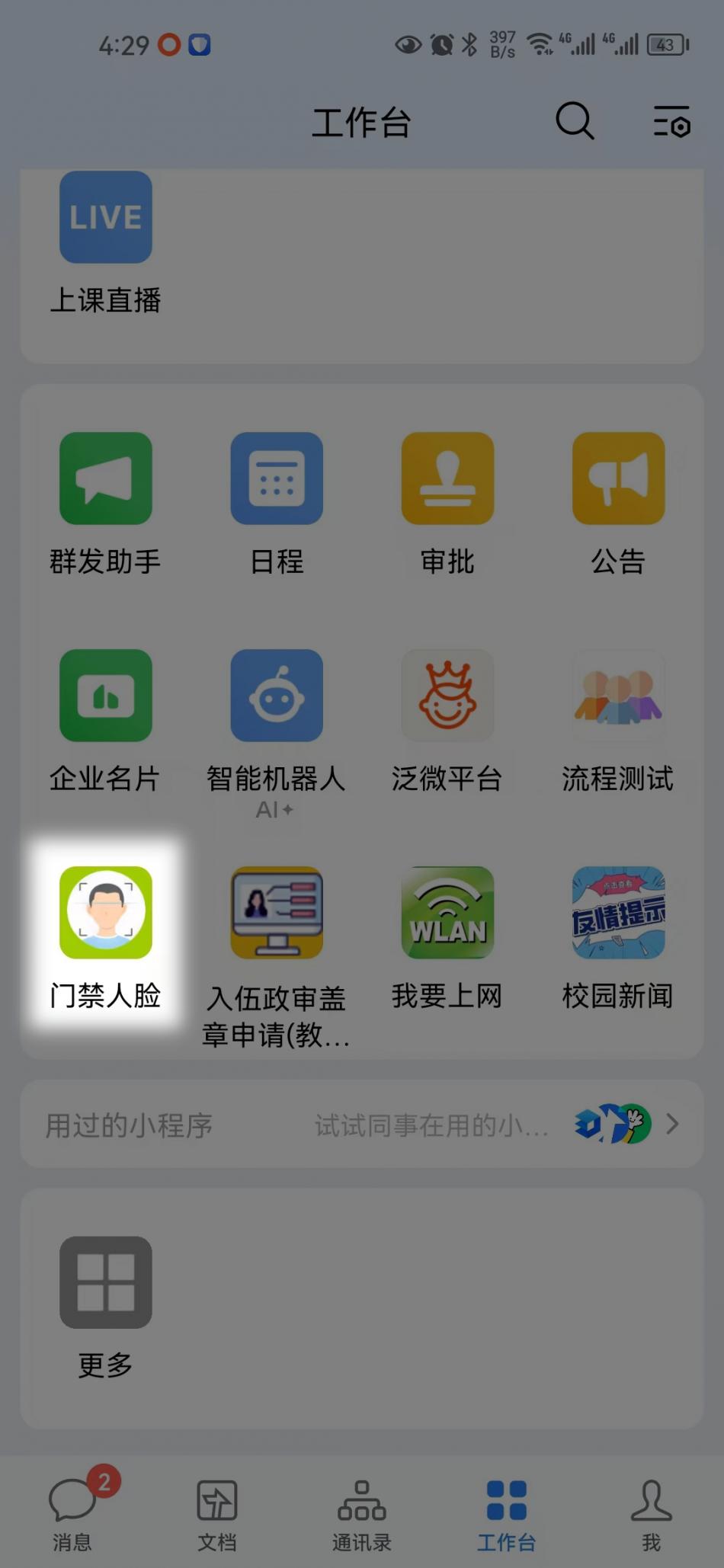 1:手机打开“企业微信”APP,切换到工作台,初次使用请打开“门禁人脸”功能,进行出入校园的人脸采集。操作入口如下: